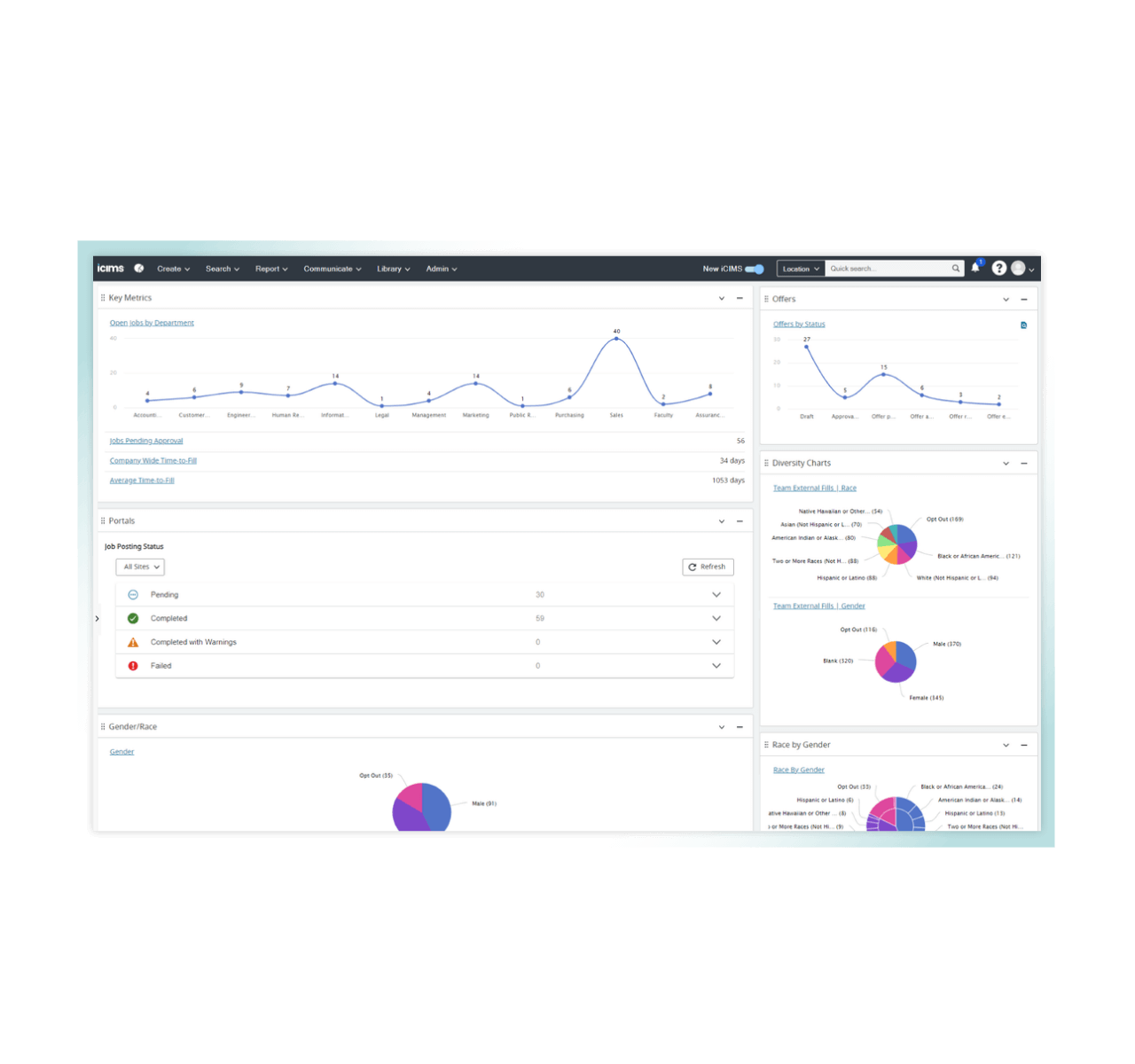 Les clients de iCIMS bénéficient d’une vue globale de leurs données de recrutement. Nous proposons des tableaux de bord analytiques détaillés, configurables selon vos besoins, qui permettent d’accéder aux informations essentielles en un clin d’œil. Partagez des rapports de haut niveau avec les dirigeants ou entrez dans le vif du sujet avec vos administrateurs système et vos recruteurs. Nos analyses sont flexibles, personnalisables et vous donnent un aperçu nécessaire de la performance du recrutement, y compris les initiatives de diversité, à travers votre effectif.